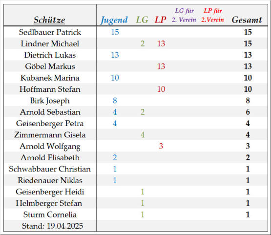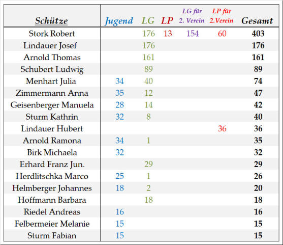 RWK-TeilnehmerstatistikSeit 2003 hatten wir bisher 176 Wettkämpfe mit der Luftgewehrmannschaft und 94 Wettkämpfe mit unseren Jugendmannschaften!Seit der Saison 2018/2019 haben wir auch eine Mannschaft mit der Luftpistole gemeldet.Hier ein kurzer Einblick über unsere Teilnehmer an diesen Wettkämpfen!